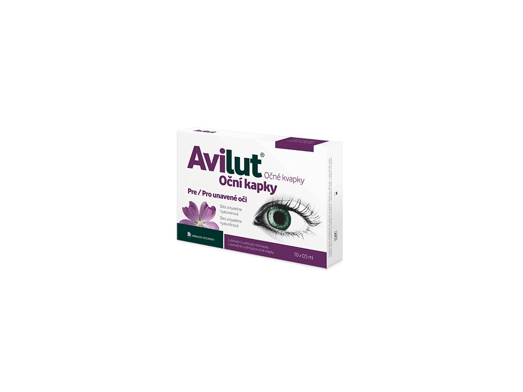 Očné kvapky AVILUT® sú s lubrikačným, zvlhčujúcim účinkom na báze destilovanej vody s výťažkom zo slezu a s kyselinou hyalurónovou v praktickom sterilnom balení po jednotlivých dávkach.