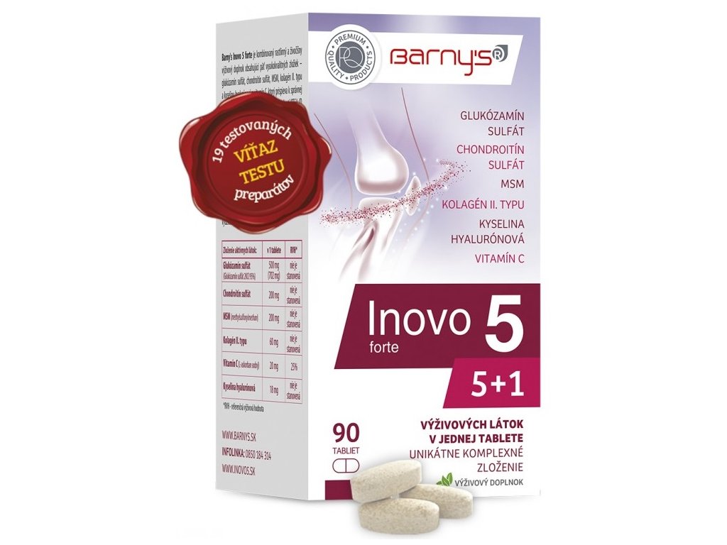 Výživový doplnok Barny´s Inovo 5 forte - kombinovaný rastlinný a živočíšny produkt obsahujúci zložky – glukozamín sulfát, chondroitín sulfát, MSM, kolagén II. typu, kyselinu hyalurónovú a vitamín C, ktorý prispieva k správnej tvorbe kolagénu a k správnej funkcii kostí a chrupaviek.