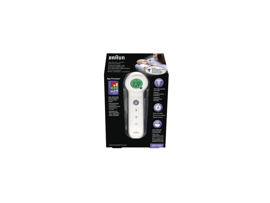 Teplomer určený pre tých najnáročnejších spotrebiteľov, ktorí nechcú nechať nič na náhodu. BNT400 kombinuje jednoduché používanie dotykového aj hmatového merania s unikátnou technológiou Age of Precision® spoločnosti Braun, ktorá pomáha rodičom eliminovať pochybnosti pri meraní teploty.