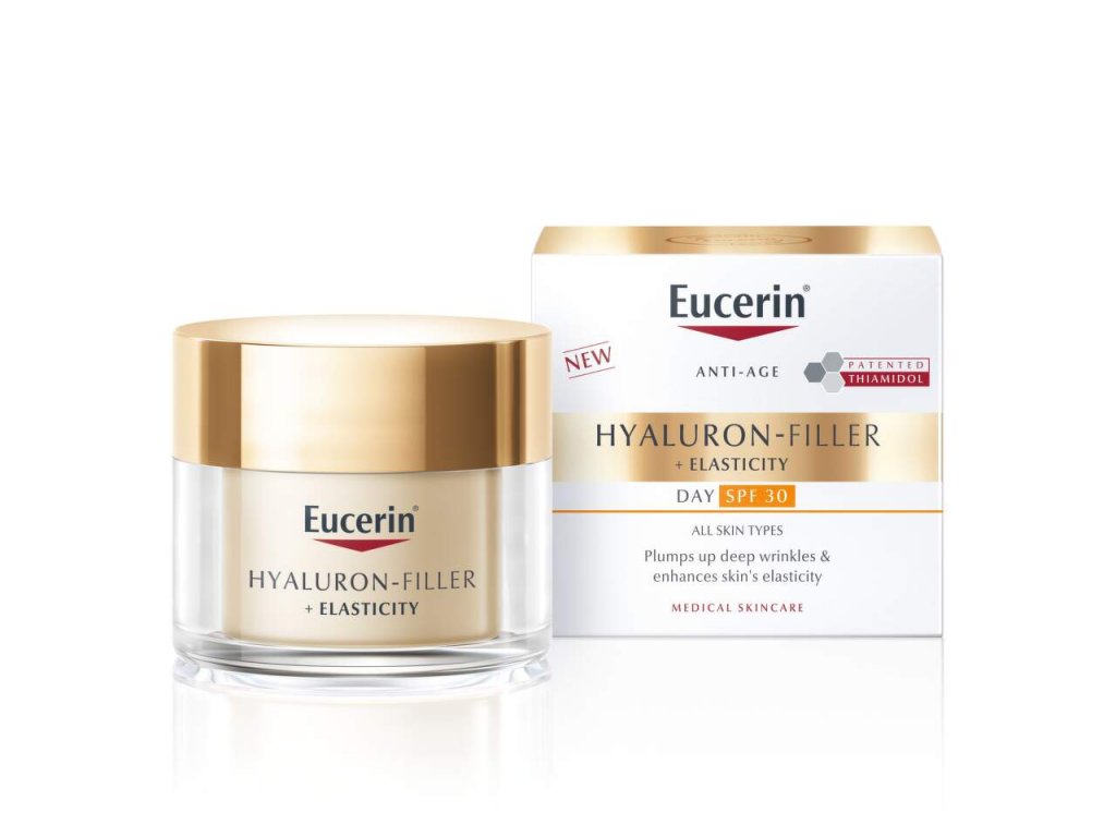 Eucerin Hyaluron-Filler + Elasticity Denný krém SPF 30 je denný krém proti starnutiu, ktorý vypĺňa hlboké vrásky, zlepšuje pružnosť pleti a redukuje pigmentové škvrny.