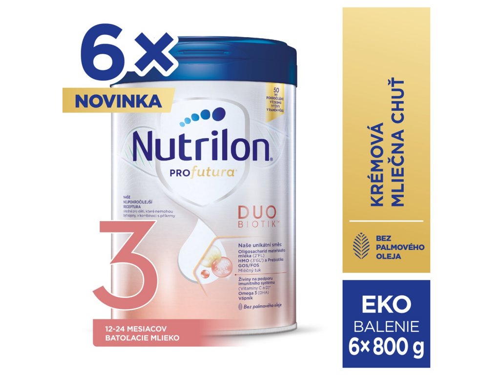 Nutrilon 3 mlieko Profutura obsahuje zmes dobre využiteľných tukov s pridanou DHA, unikátnu zmes oligosacharidov scGOS/lcFOS napodobňujúce funkciu oligosacharidov materského mlieka,ktorejúčinky na zdravie detí boli klinicky testované. Oligosocharidy sú využívané črevnou mikroflórou Vášho dieťaťa. Navyše obsahuje LCP mastné kyseliny a nukleotidy v odporúčanom množstve poprednými špecialistami na výživu.