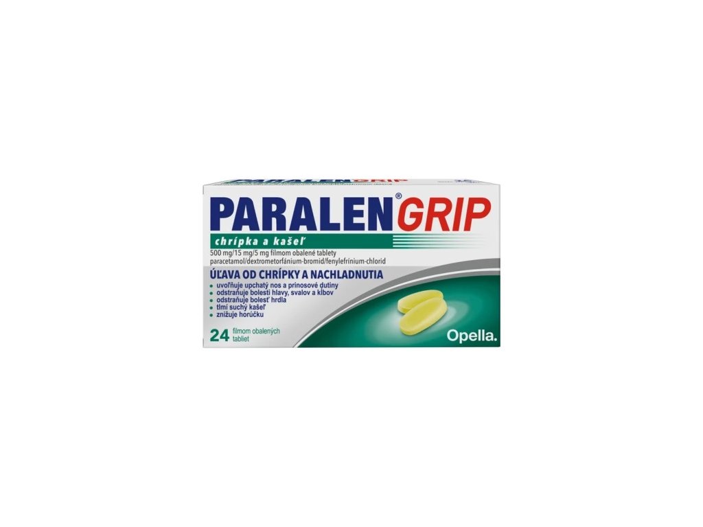 Je určený k odstráneniu príznakov chrípky a nachladnutia sprevádzaných suchým kašľom a upchatým nosom. Prináša úľavu od horúčky, bolesti hlavy, bolesti hrdla, bolesti svalov a kĺbov, suchého kašľu, uvoľňuje upchatý nos a prínosové dutiny, a tým uľahčuje dýchanie. V tabletách lieku PARALEN® GRIP chrípka a kašeľ sa priaznivo uplatňuje kombinácia paracetamolu (pôsobí proti bolesti a horúčke), dextrometorfánu (tlmí kašeľ) a fenylefrínu (uvoľňuje dýchacie cesty).