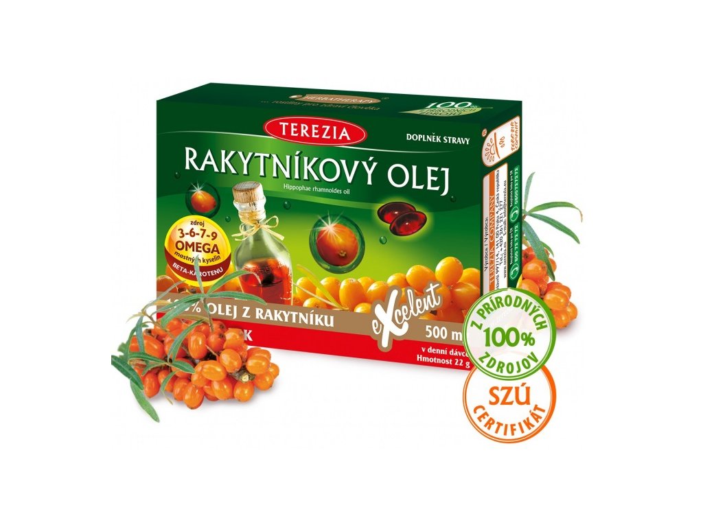 100% čistý rakytníkový olej je najcennejšou surovinou, ktorá sa získava z rakytníka rešetliakovitého. Je vyrábaný lisovaním za studena a neobsahuje žiadne ďalšie prísady. Rakytníkový olej vo forme toboliek je čistý prírodný produkt, ktorý sa používa vnútorne. Rakytník rešetliakovitý prispieva k prirodzenej obranyschopnosti organizmu, podporuje činnosť tráviacej sústavy a srdca. 100% čistý rakytníkový olej je dostupný aj vo forme kvapiek, ktoré môžeme užívať aj zvonku na pokožku. Pomáha ju udržiavať zdravú a má na ňu blahodarný vplyv.
